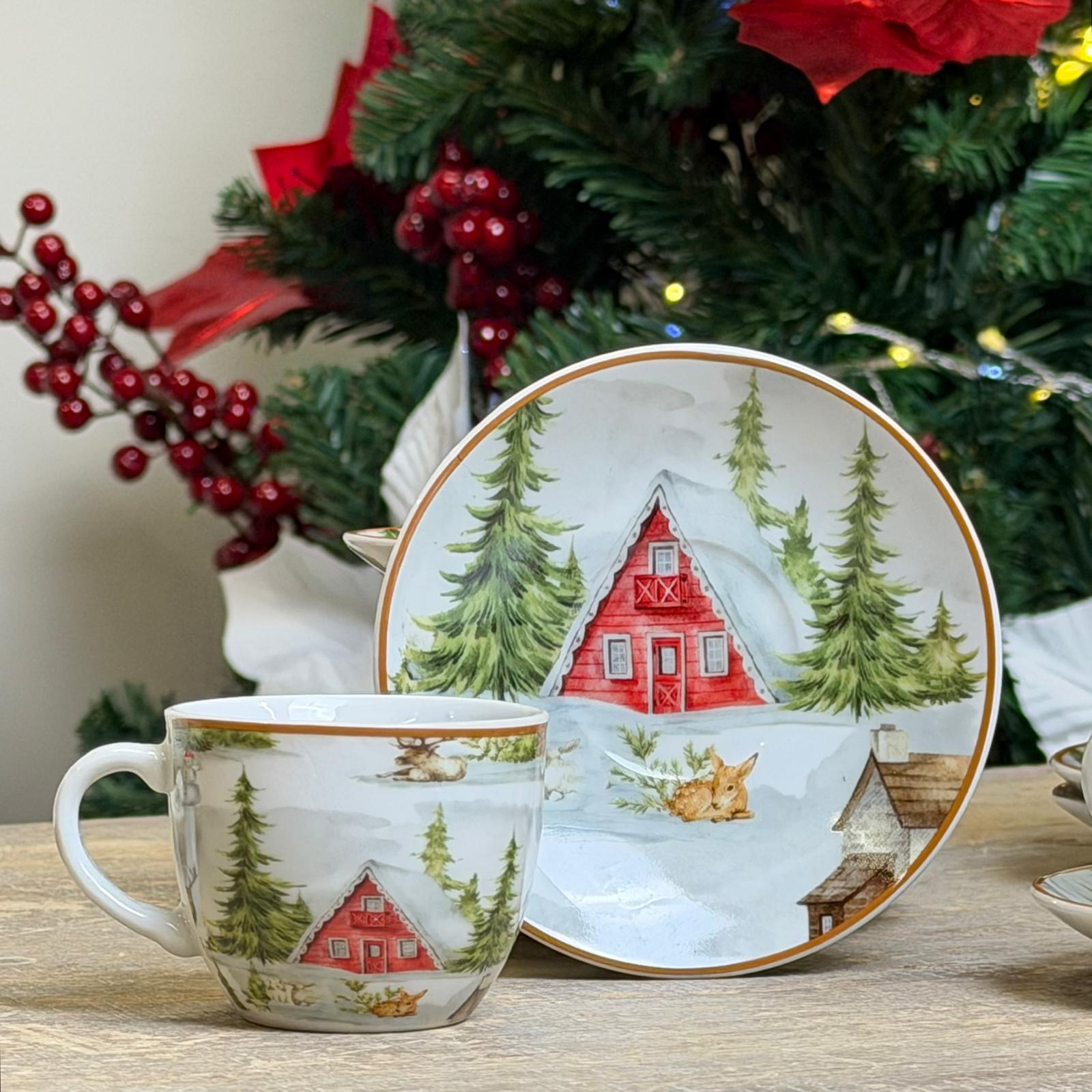 Un set di 6 tazze da thè con piattino, perfetto per momenti di relax e convivialità. Ogni pezzo presenta un bordo color tortora che incornicia uno sfondo bianco, all’interno del quale è delicatamente raffigurato un tipico paesaggio alpino che evoca l’atmosfera calda e accogliente delle vacanze in montagna.